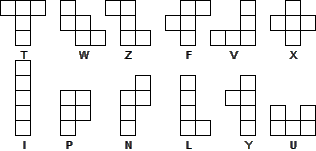 The first step is to find what the base pentominoes look like, ie, the 12 shapes that are distinct whatever rotations and reflections are used. These have been given names, sometimes rather fanciful, in various ways. The picture below uses the original names (due to Solomon Golomb), but only for reference purposes in the text that follows.