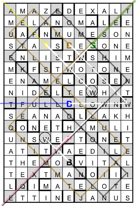 The grid represented a snooker table with the coloured balls on their spots. Extra letters from clues spelt “Pot the six colours in sequence”, so Y(ellow), G(reen), B(rown), B(lue), P(ink) and B(lack) were to be cleared, in a break scoring 27. The seven Ws in the grid gave the successive positions of the white ball (ie, where the WHITE LIES, from the grid entry that would be 27dn in normal grid numbering) during the clearance. There were no Rs in the grid (all the reds having been potted) and no extra “colours”, but every other letter of the alphabet appeared at least once. The grid before clearance is shown here, with each ball’s path marked in the appropriate colour.