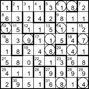 After filling the grid, reading the columns as alphabet positions, ie 16 18 15 4 21 3 5 → PRODUCE and so on, gave the message “produce 38 hailstone numbers from 988 and fill grid”. The entries in the grid then had to be erased, apart from the circled cells, and refilled using the hailstone sequence starting 988, 494, 247, 742, 371 and so on.