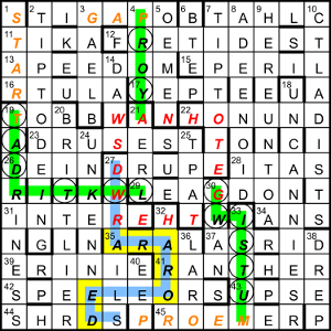 The initial grid is shown here. The circled letters were changed to show POOKA, FURRISKEY and MAC COOL starting from the ends of words in the perimeter that mean “opening” (GAP, START and PROEM respectively) and following the green paths inward to THE RED SWAN HOTEL. The initial letters of the extra words in clues, in clue order, were ARAROED (in the yellow cells here); changing them to the extra words’ last letters, MOTTRLI, showed DERMOT TRELLIS getting away (following the blue path). Alternative paths with either of the Es in 40dn changed to L were accepted, though these involved diagonal moves.