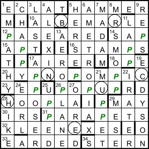 P was the only letter not used as an extra in any clue’s wordplay. Starting from 33ac, the extra letters spelt out “nothing but [p]eas”, describing the experimental diet prescribed by the Doctor for the title character in Georg Büchner’s play Woyzeck. The circled letters in the grid formed BÜCHNER and the extra letters from the asterisked clues formed WOYZECK. Most of the letters in the filled grid (shown here) were erased to leave “nothing but Ps” in the shape of a large W for Woyzeck. The puzzle’s title referred to the soldier Woyzeck being on a diet of peas.
